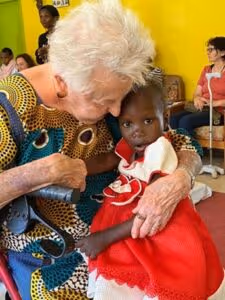 Dr Anne Merriman with a patient in day care at Hospice Africa Uganda. (Photo credit: Niall O’Sullivan)